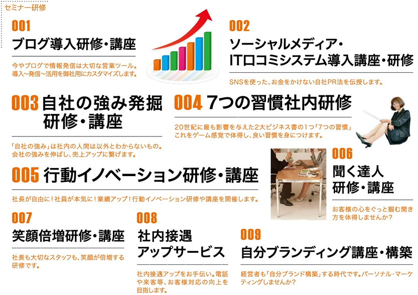 「セミナー研修」「事務作業」「代行」「直し・相談」の4分類からなる『39』のサービスで、笑売繁盛が、お客様の売上アップにご協力させていただきます。